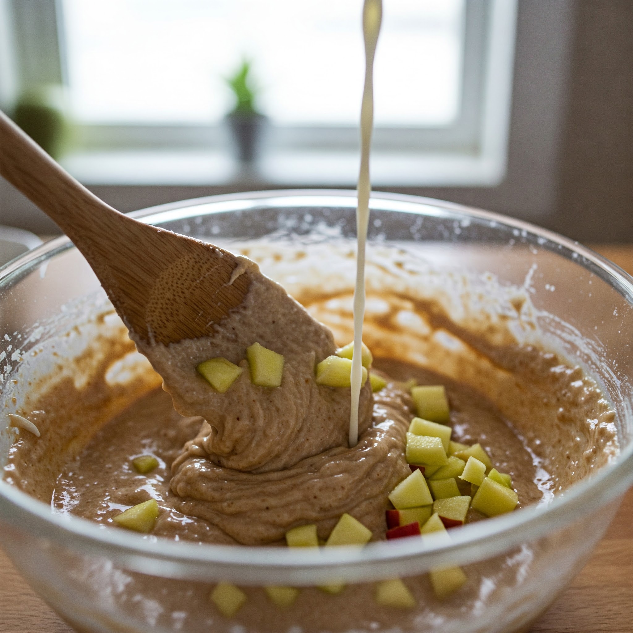 4. Shtoni përbërësit e lagësht te përbërësit e thatë dhe përziejini butësisht derisa të bashkohen.