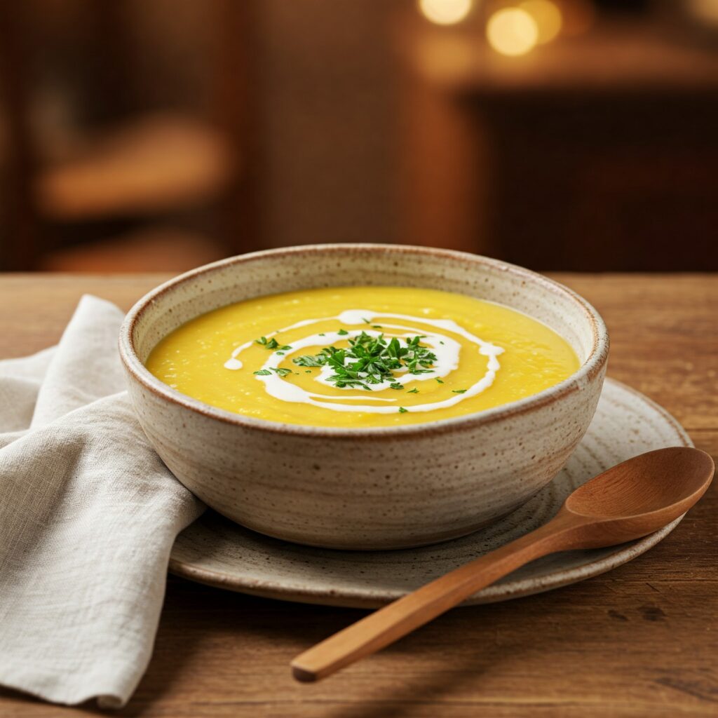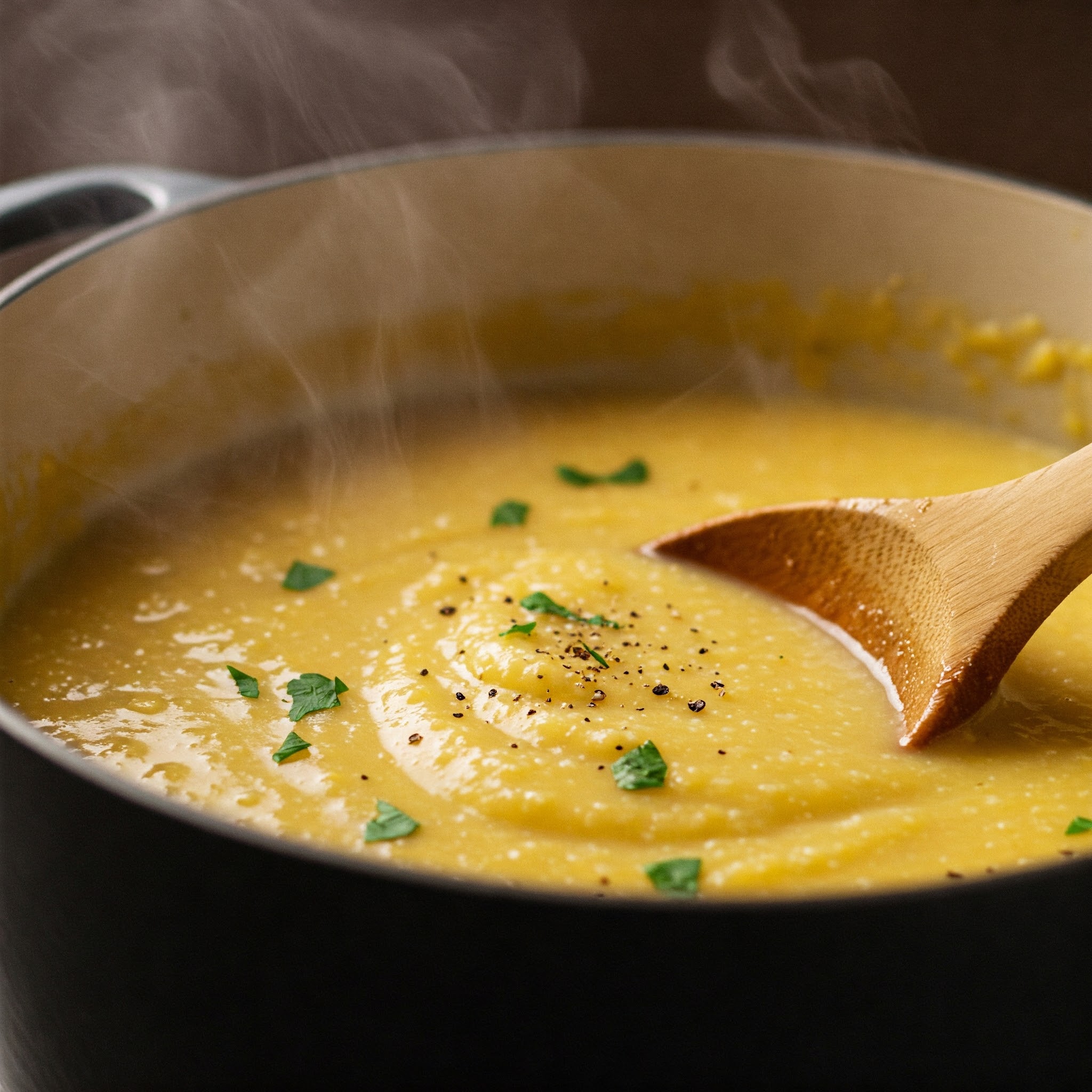 Kjo supë kremoze me miell misri është një pjatë e butë dhe e ngrohtë, perfekte për ditët e ftohta të dimrit. Me një teksturë të lëmuar dhe një shije delikate të misrit, kjo recetë është e pasur me vlera ushqyese dhe shumë e lehtë për t’u përgatitur. Është ideale për një vakt të lehtë ose si antipastë për një darkë të veçantë.