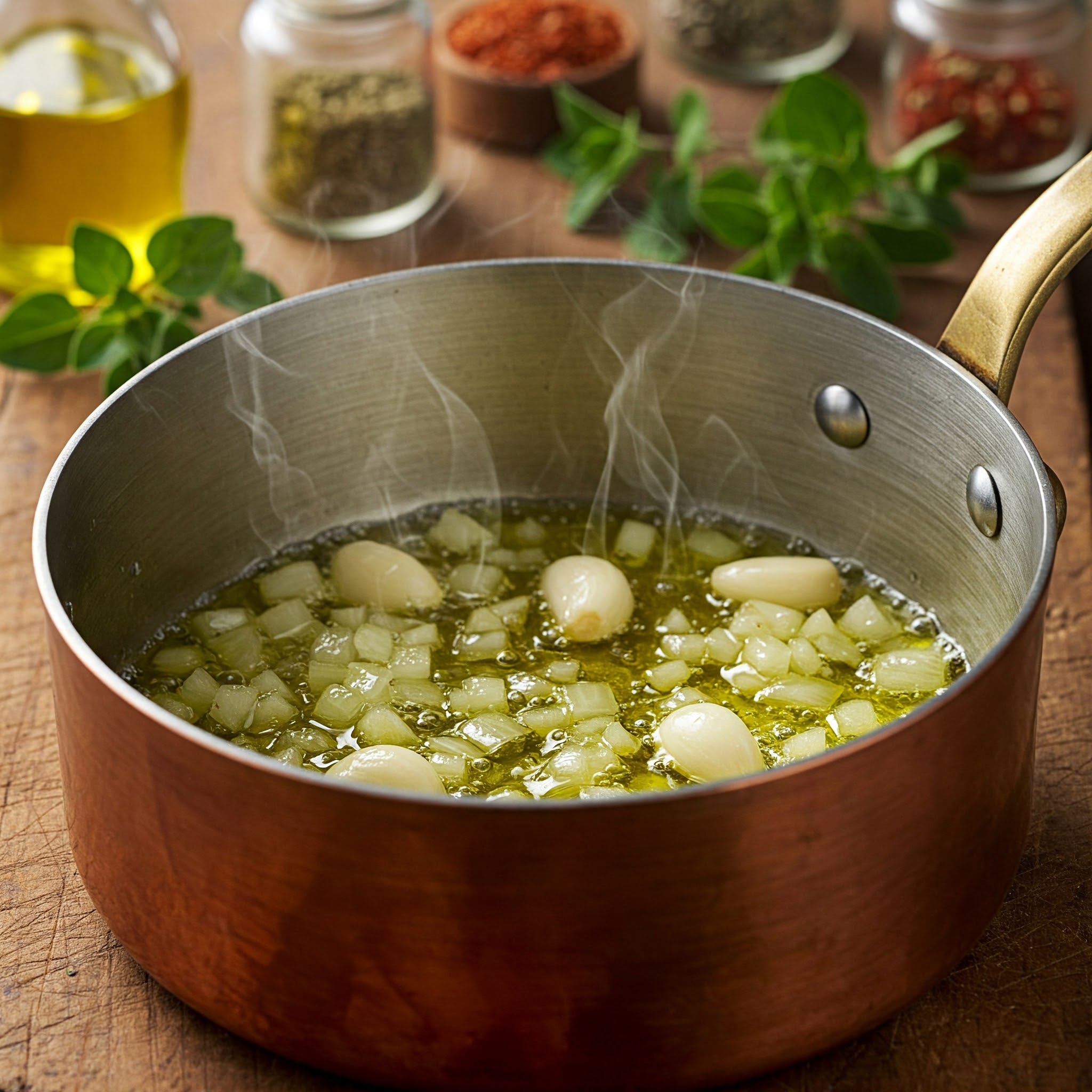 Në një tenxhere të mesme, ngrohni vajin e ullirit ose gjalpin dhe kaurdisni qepën dhe hudhrën derisa të zbuten (rreth 2-3 minuta).